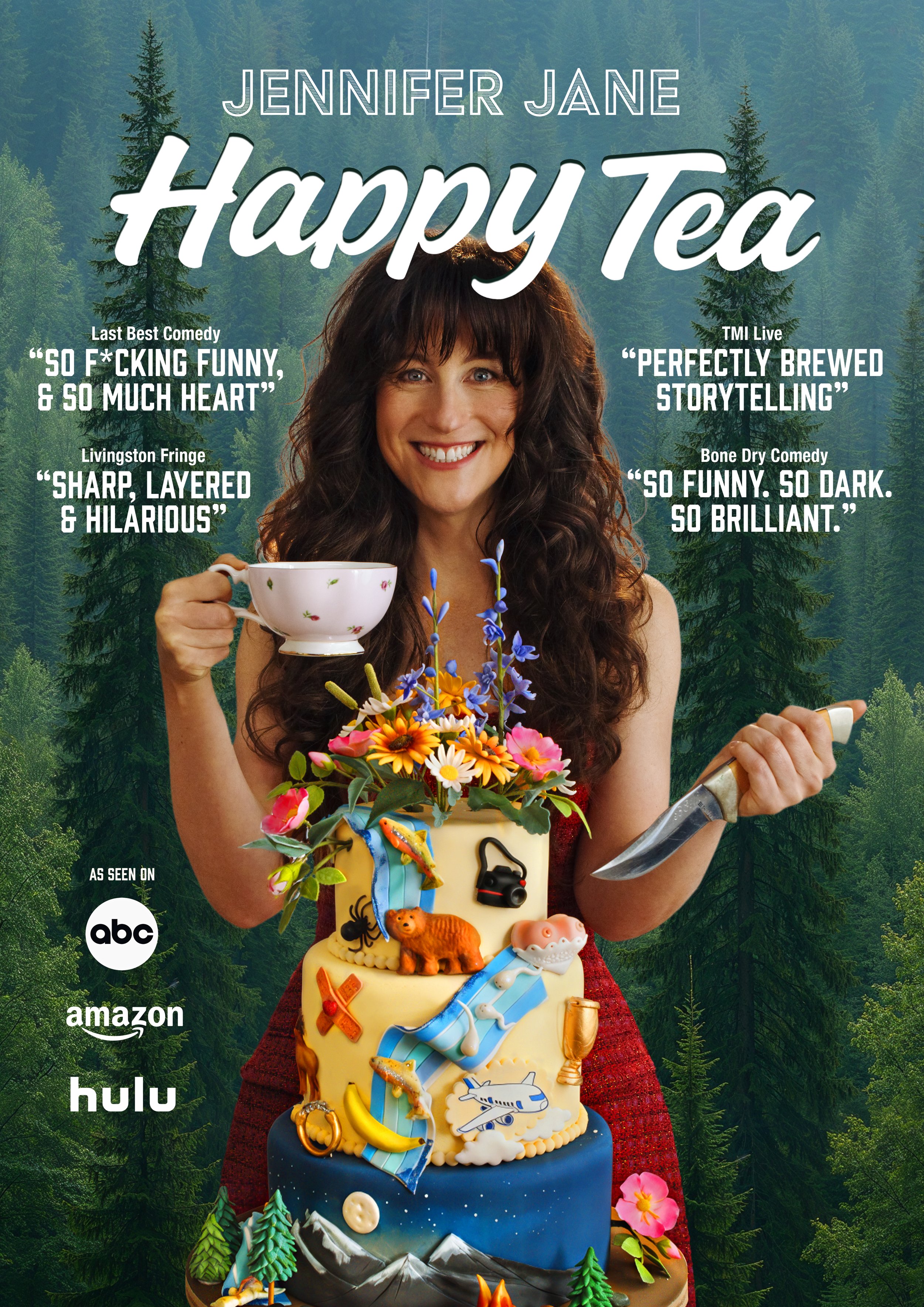 Promotional poster for the comedy show "Happy Tea" featuring Jennifer Janes holding a tea cup and a knife, with a colorful, multi-tiered cake decorated with toys and flowers, set against a forest background - Jennifer Jane Comedy